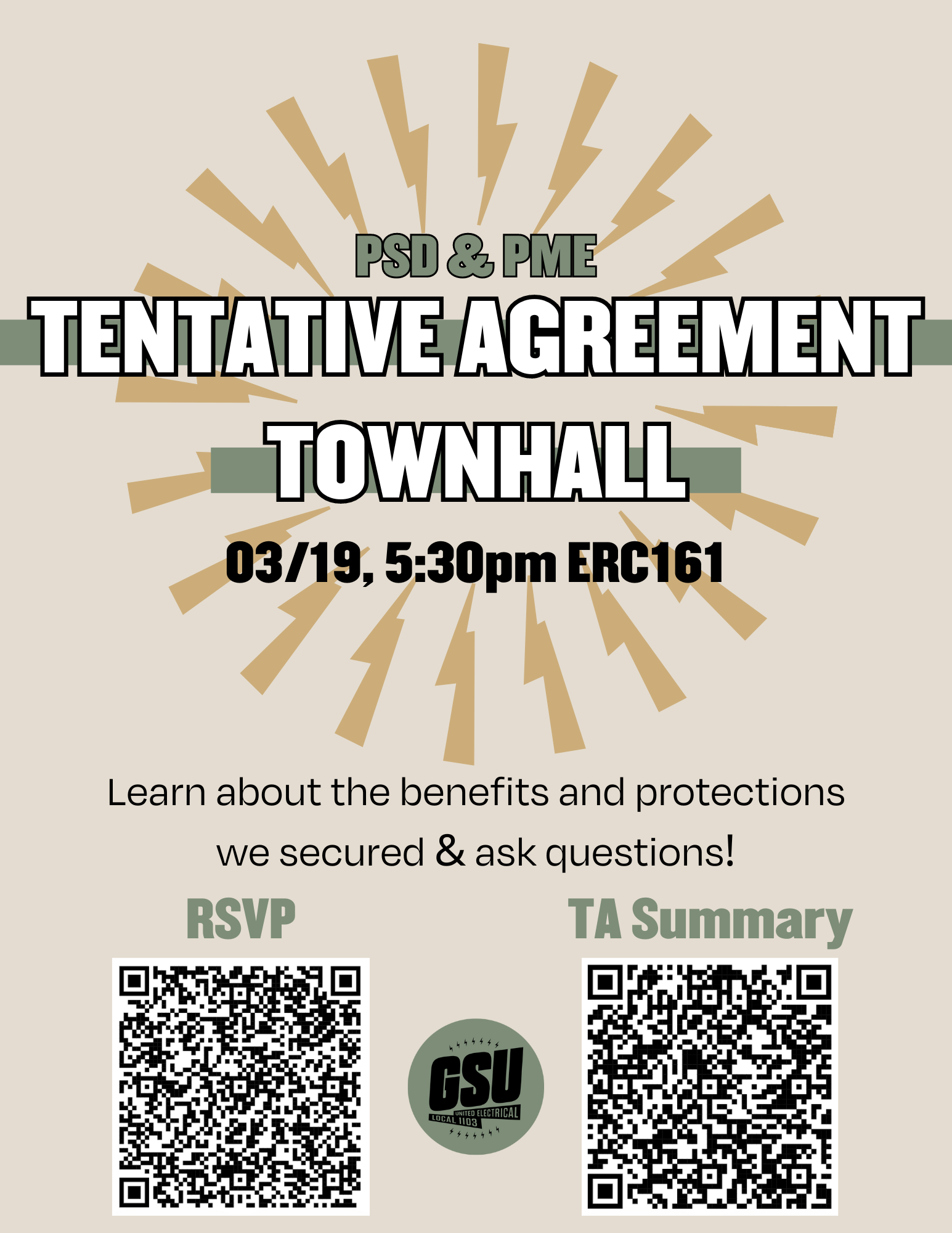 PSD & PME Contract Ratification Town Hall Tuesday, March 19, 2024 5:30 PM 6:30 PM ERC 161 (map) Google Calendar ICS This townhall is aimed at answering all contract related questions, and understand the timeline to ratification and what steps members need to take to ratify of the contract.When: Wednesday, March 19th at 5:30PMWhere: ERC 161RSVP HERE!